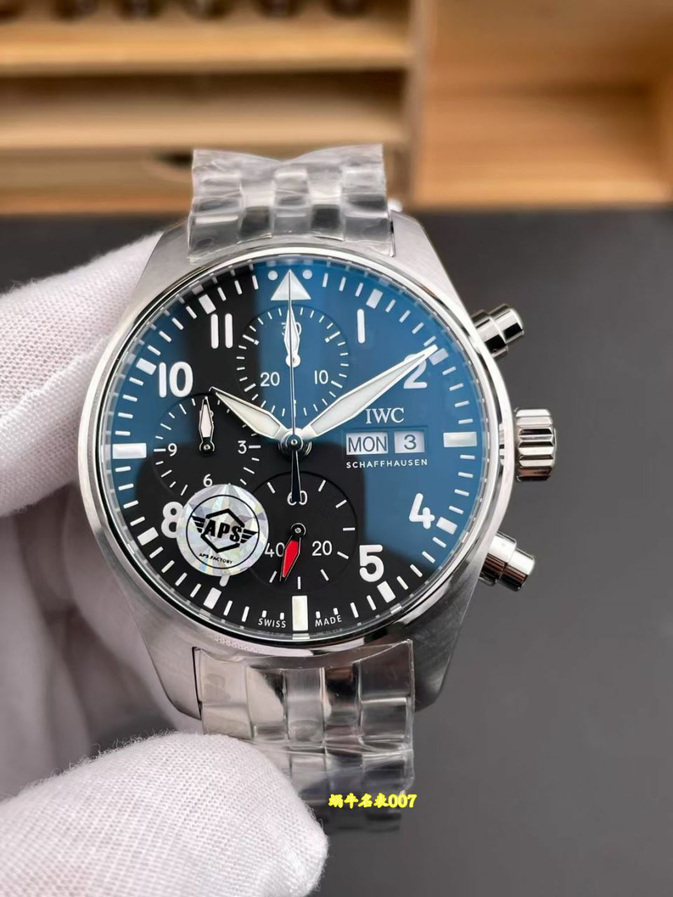 Aps新品飞行员系列腕表,万国飞行员计时码表(IWCP)系列,源自1930年代,专为飞行员打造。标志性设计包括坚固表壳、清晰读时、防磁软铁内壳。可快速连续计时。风格硬朗专业,兼具实用与经典,是航空腕表领域的代表之作。 表壳: Aps 原版开模,3D立体建模一比一设计表壳,使壳型质感完美复制原版手感,表壳侧面拉丝细腻,倒角抛光处理更加精细 表带:Aps 原版开模的表带采用最新款飞行员计时码表设计的快拆式表带,一键拆卸,方便快捷,钢带表扣伸缩式,方便调节长短 表盘:Aps 表盘与原版相比丝毫不逊色,飞行员表盘设计极致强调清晰易读。其标志性元素包括:大尺寸夜光指针、镶贴数字时标、高对比度配色(如黑底白字)飞行员表款配有三角形指示符和超长秒针,确保在任何光线环境下都能实现瞬间精准读时,功能性至上。 机芯:aps 原版开模设计的全新定制cal.69385一体机,耗时三年,231个零件完美复制,采用最高级的计时码表导柱轮设计,使其稳定性更加,计时更加流畅,摆轮位置在8点钟方向与原版一致,区别7750的11点位置 Aps出品,只为精品