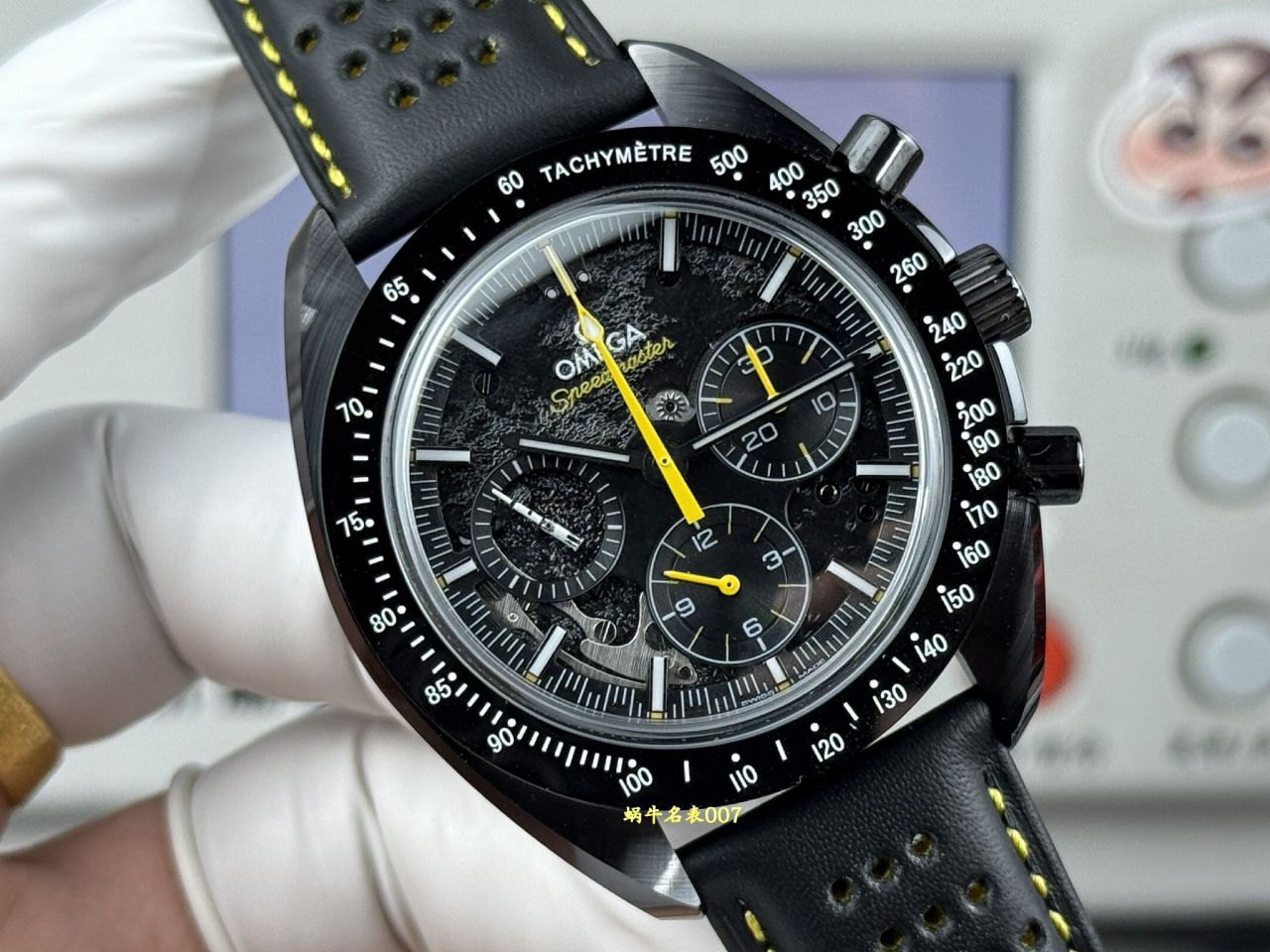 BLS新品 首次采用“全陶瓷”工艺,欧米茄 最新超霸系列 月之暗面腕表,陶瓷是一种通过高温烧制而成的无机非金属物质。这一材质可以用于制造机械性能特殊的高密度腕表部件。陶瓷是消费者在选购腕表时备受青睐的材质之一,这得益于其瞩目而多样的色彩和特殊性能,陶瓷的重量比精钢轻两倍,耐磨、高抗划性、高生化惰性、低过敏性而且无磁性。这款腕表的表壳尺寸为44.25毫米,搭载经过黑化处理的机芯,并通过激光烧蚀技术在机芯夹板呈现月球表面的真实景象,旨在致敬超霸腕表为“阿波罗8号”任务做出的杰出贡献。透过黑色阳极氧化铝的镂空表盘,清晰可见人们从地球可以观测到的月之正面(近地面),表背则展示了仅有宇航员看到过的 “ 月之暗面 ”(远地面)。 腕表搭配黑色微孔橡胶表带,中间饰有黄色橡胶材质内衬,引人瞩目⁠。整枚腕表采用黑色陶瓷打造而成,中央计时秒针饰以黄色亮漆,表圈饰有激光镌刻的亮白色珐琅测速刻度。小秒盘指针采用五级钛金属材质制成,以别出心裁的“土星5号运载火箭”造型呈现。这一3D立体造型由激光车削技术制成,并由附着白漆、激光烧蚀和激光黑化工艺呈现出了不同的色彩效果。