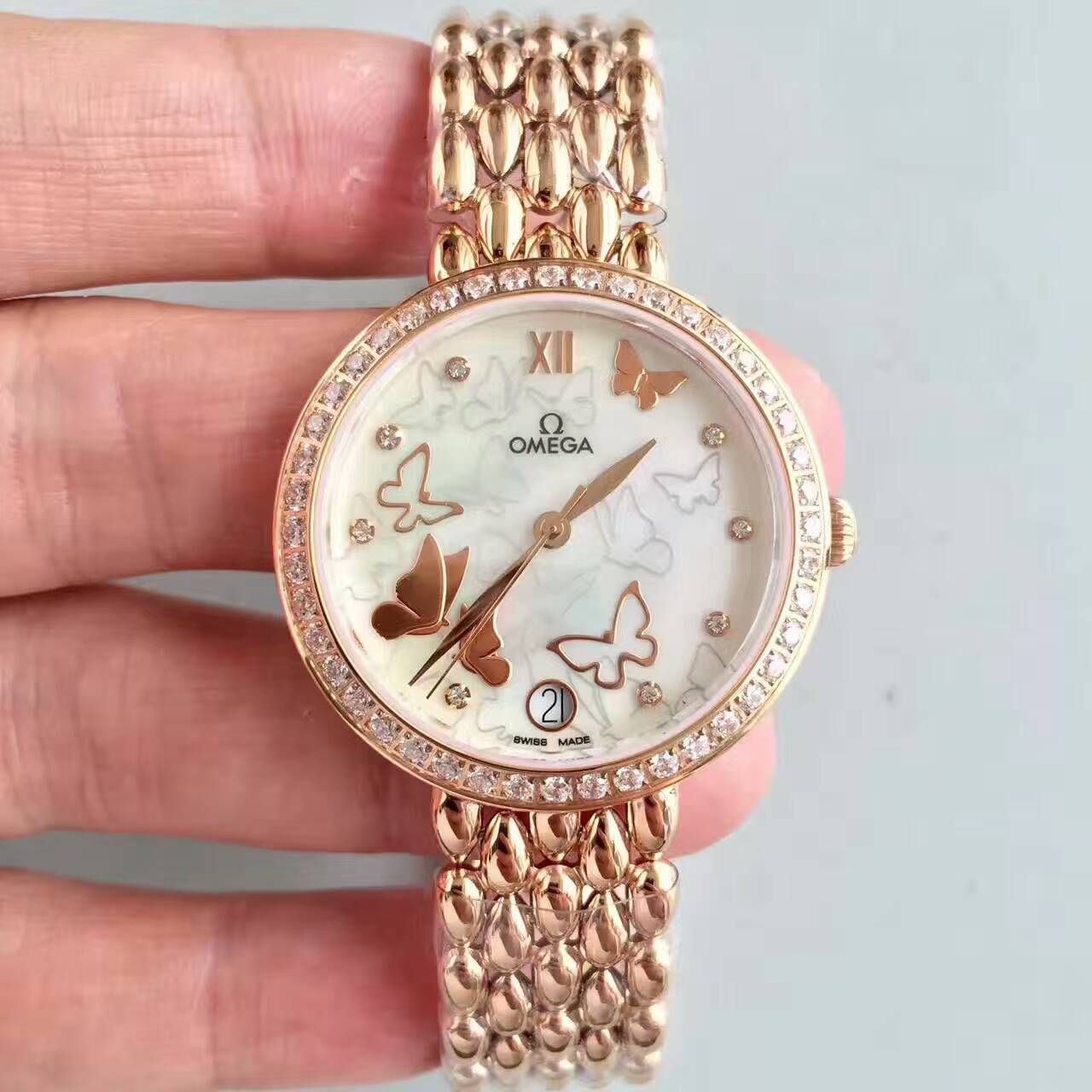 欧米家蝶飞系列。原版开模一比一复刻高品质女士腕表 珠光珍珠贝打造,呈现性感优雅 简约纯美效果。钻石搭配罗马刻度圆弧形双面防反光耐磨损蓝宝石水晶玻璃,叶形指针以及五节水滴形表链 承载瑞士石英机芯 小号27.4毫米跟中号32.7 毫米 2个尺寸