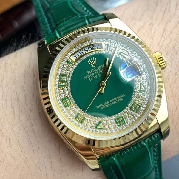 (劳就要有金有钻)劳力士ROLEX星期日历型day-date 36mm系列118138皮带绿珐琅满天星少量到货!劳力士满天星在名表里面就像一颗闪闪发光的明星,气质魅力无可匹敌。它的技术细腻而巧妙,其面泽和材质更是完美的晶体形成,散发出一种优雅而雅致的气质!此次搭载的依然为了配合官方厚度一致采用2836全自动机械机芯,表盘尺寸官方一致36mm,属于中性尺寸,表盘采用绿面珐琅进口技术镶钻而成,每颗钻石都整齐的环绕着表盘,所有的目光似乎都聚焦在这一圈钻上!从每个细节均注重如一!配置原装表扣!玻璃上的防伪标识依然居中可验,内影编码均与官方一致采用832118序号!压轴之作,闪亮登场!