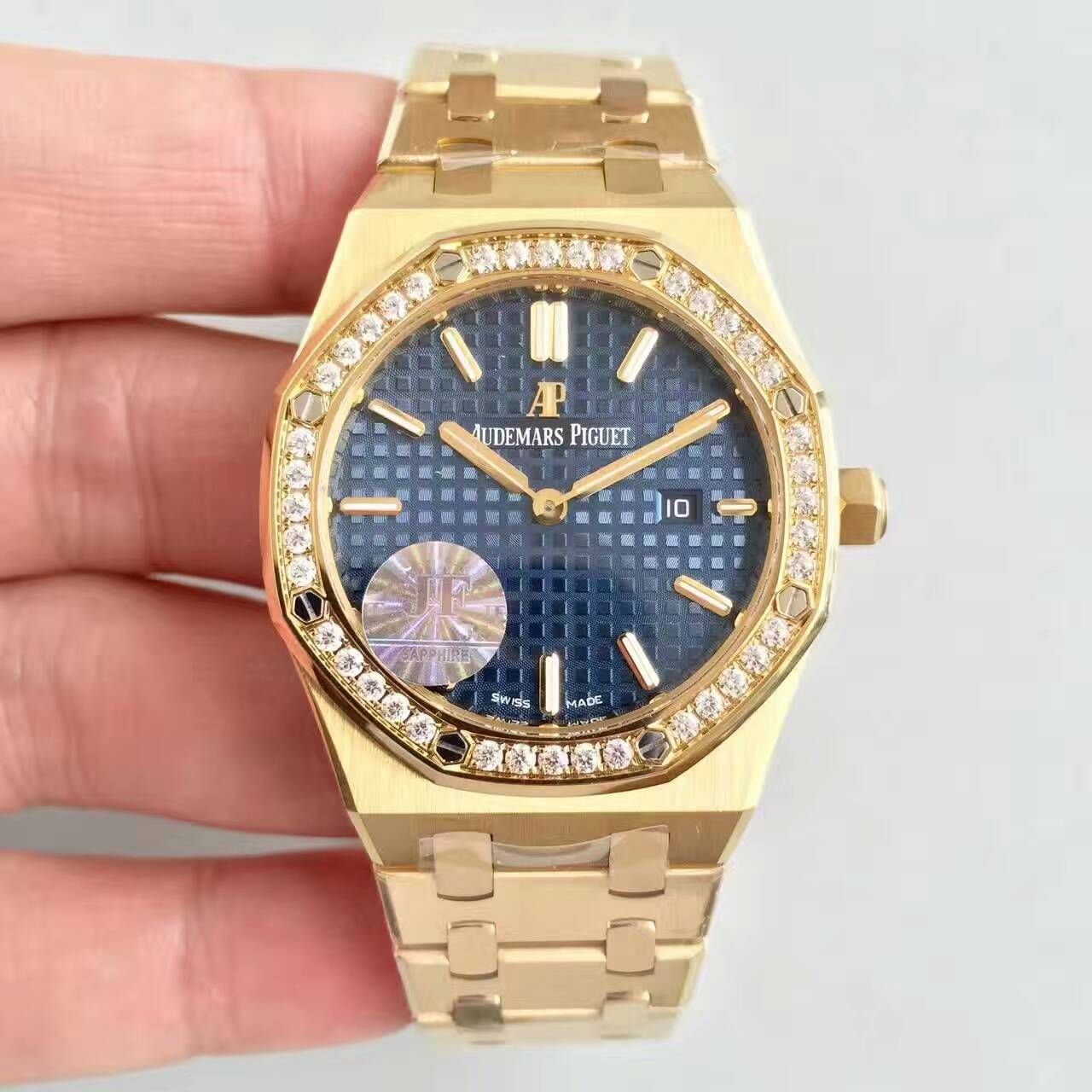 JF精品 AP爱彼67650 行业唯一买正品开模,厚度与结构和原版一样 釆用原版同类ETA石英金面机芯,ETA石英机芯是12点快跳日历。表带罗丝双边抛光和扣子唛头完全原版一致。