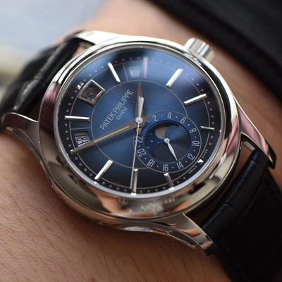 【机芯】全新月相年历表款搭载了Caliber 324 S QALU 24H/206自动上链机芯,上满链时可以提供至少24个小时的动力储备,表底采用的是背透设计,透过其蓝宝石水晶玻璃可以欣赏机芯上的精美细节,比如夹板的倒角和抛光轮廓、自动盘上雕刻的Calatrava十字星图案。