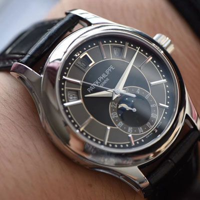 【机芯】全新月相年历表款搭载了Caliber 324 S QALU 24H/206自动上链机芯,上满链时可以提供至少24个小时的动力储备,表底采用的是背透设计,透过其蓝宝石水晶玻璃可以欣赏机芯上的精美细节,比如夹板的倒角和抛光轮廓、自动盘上雕刻的Calatrava十字星图案。