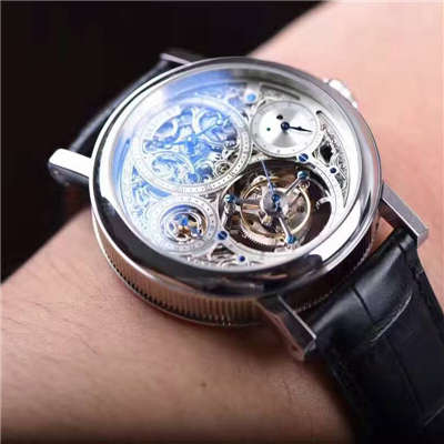 宝玑全镂空陀飞轮42mm直径前后蓝宝石镜面机芯镂空打磨精细,
