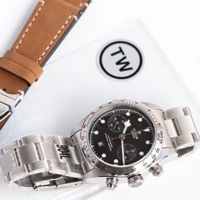 台湾厂新品——2019新款帝陀碧湾计时M79363N,新款启承碧湾计时型保留了帝陀经典雪花针造型,外观尺寸41mm 圆拱形蓝水晶防刮镜面,除了精钢计时刻度圈款式,还有黄金固定外圈,配黑面阳极氧化铝测速计字圈,金面标记,个性十足!计时按钮使用cnc数控切割成型,实现可锁定启动复位按钮对版原装。旋入式把头深度防水,搭载一比一功能的7750自动机械机芯运行精准稳定。臻于品质,感受系列,台湾厂出品新款帝陀碧湾计时款,你值得拥有!