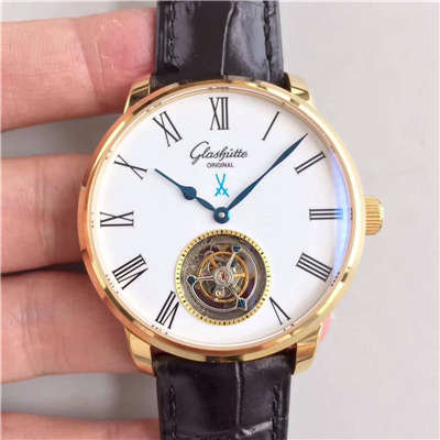 GF格拉苏蒂原创精髓参议员系列,首款全自动机械陀飞轮手表,搭载定制版托飞轮机芯,摆幅:21600.尺寸42x12.5mm,手绘陶瓷表盘,淬火烧钢蓝表针,蓝宝石水晶镀蓝膜玻璃,原装折叠表扣,进口意大利牛皮,完美做工演绎精髓复刻