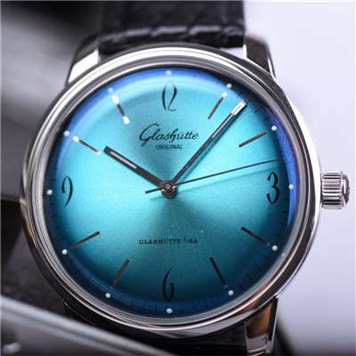 格拉苏蒂原创20世纪复古经典款!39mm直径!超炫表面和拱形镜面、烫金自动陀、锅盖蓝宝石玻璃蓝面镀膜通透无敌!镀银表盘完美弧度搭配烧钢蓝针美感也是很屌!搭载进口9015零返修机芯!