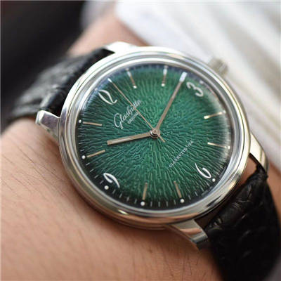 YL最新力作 格拉原创六零年代系列腕表,该款腕表设计了很多符合1960年代的复古元素,拱形的蓝宝石玻璃表镜,渐变面调祖母绿的复古表盘,带有精致纹路,重现40年历史压花模工艺,带有夜光显示的指针搭配富有年代感的阿拉伯数字时刻,所有元素综合只为致敬经典。该款为三指针搭配39毫米外壳款式,产品型号:1-39-52-03-02-04
