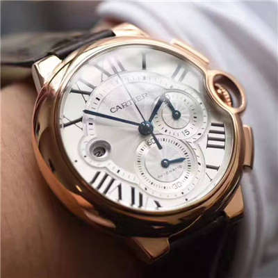 卡地亚蓝气球计时(6字位常规小秒″,3字位30分钟计时, 功能1:1), 采用立体式烧钢蓝指针(淬火蓝钢指针,同正品一样的亮蓝,)深碗形日历窗口及日历字体(复刻介独有采用碗型窗口),把头圆润饱满,壳身线条完美复刻。正品开模不惜成本只为媲美正品!