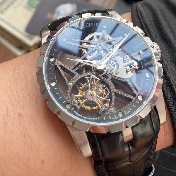复刻腕表总是有一些不可或缺的地方、但我们尽所有能力在完善不足的细节。此次全新研发罗杰杜彼王者系列陀飞轮机芯,凭借研发机芯优势成功克隆RD505SQ镂空一体陀飞轮机芯(非市面其他版本为夹板机芯可比)