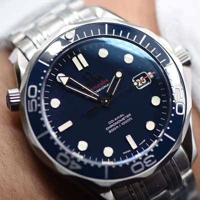 欧米茄蓝面经典海马系列300M精品41mm直径,单向旋转陶瓷表圈,蓝宝石镜面镀蓝膜,螺丝把头,