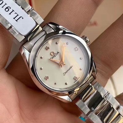 专柜爆款,独家首发!欧米茄海⁠马⁠系⁠列Aqua Terra女士腕表环镶璀璨美钻⁠⁠,诠释精致迷人风范⁠⁠。这款精钢腕表采用对称设计28毫⁠米表径,非常秀气、精美绝伦!配备闪烁微光的白面表盘⁠⁠,8枚圆点镀铑小时刻度和4枚钻石小时刻度贴镶于镀铑托槽之上⁠⁠。指针亦经过镀铑处理⁠⁠,表背于波纹背景之上浮雕欧米茄海马徽章图案⁠⁠。腕表搭配精钢表链⁠⁠,内部搭载欧米茄4061机芯⁠⁠。配全套包装,带GTC证书出货!