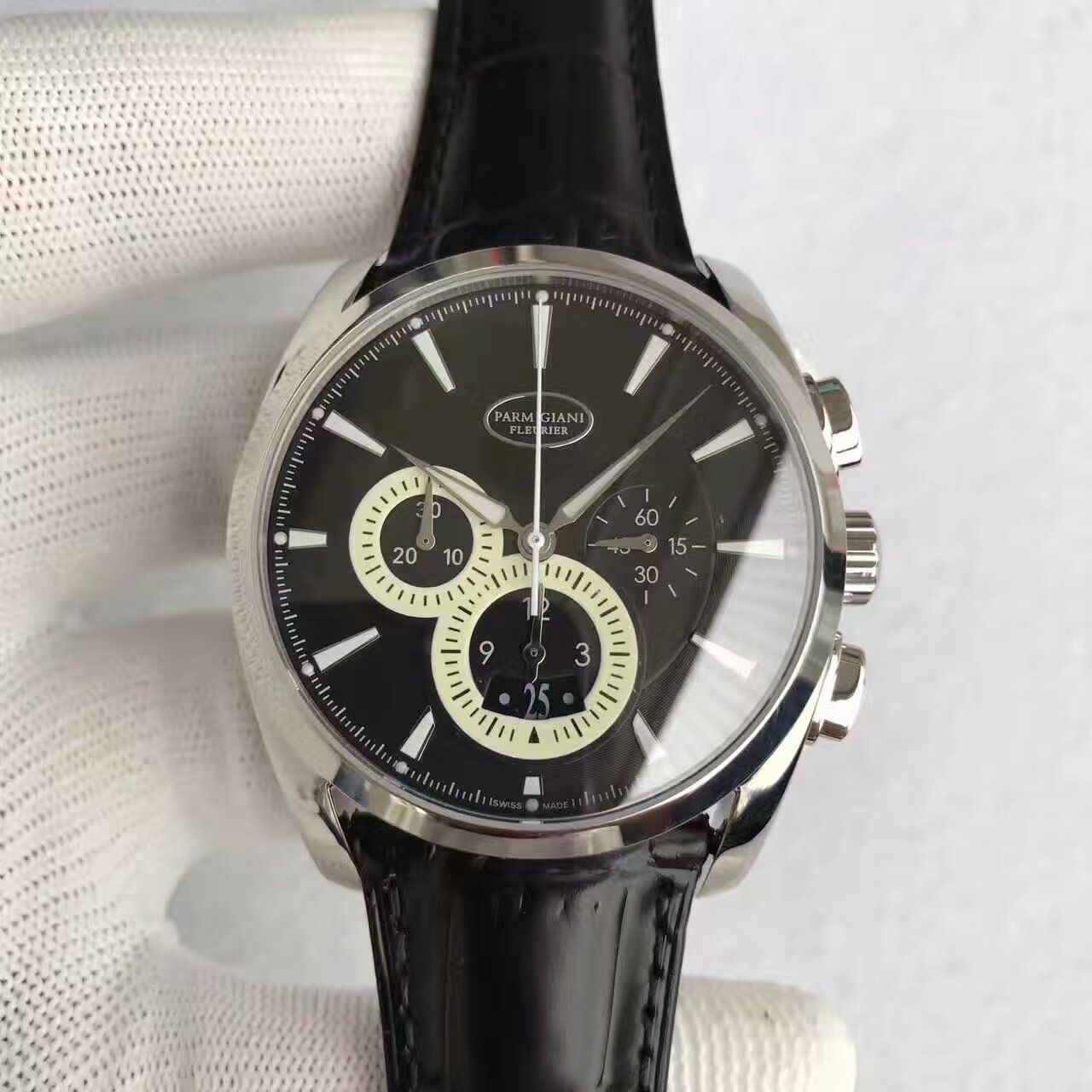 爆款第二波少量来袭最新款帕玛强尼Tonda系列,耗费大量时间研制开发,顶级工艺一比一打造,还原正品气质,霸气十足。独有设计“8”字样的计时盘设计,时分针与刻度均有镀铑处理并覆盖荧光涂层。尺寸42mm,7750自动机械机芯,自动陀太阳纹处理和机芯每一个功能都与正品一致。精钢表冠与面泽饱满的精钢计时按钮相辅相成,同时经过打磨处理的它们线条流畅,手感柔和,完美平滑的表面与表带的纹理形成鲜明对比。表冠采用防滑纹理设计,使得对腕表的操作更为便利。(此次发售新增两款黑面和棕面正品一致的纹路表带)