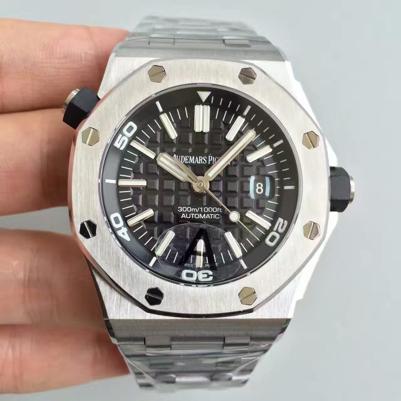 JF出品经典神器~皇家橡树离岸系列代表作(型号15710)。前后蓝宝石镜面,日历字体修正,超强夜光,9015复刻原装3120机芯,42mm直径,壳套拉丝打磨完美,进口防敏感胶带。