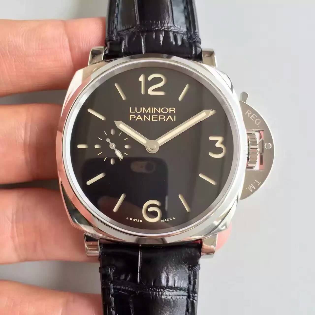 XF《原KW》新品:沛纳海676 全新Luminor Due 3 Days 壳径42mm,AISI 316L拋精钢 搭载全新黑面面阳光放射纹表盘黑,由刚玉制成的蓝宝石水晶玻璃,其厚度只有10.5mm是有史以来最纤薄的表壳 与1950系列直径相同的表款相比,其厚度减少了将近40%,能在手腕上体验不一样的感觉。