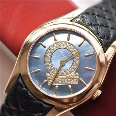 菲拉格慕新款FG4,33mm,防炫目蓝宝石,天然珍珠贝母面,小牛皮表带,50m防水,表冠黑玛瑙,奢侈顶配!