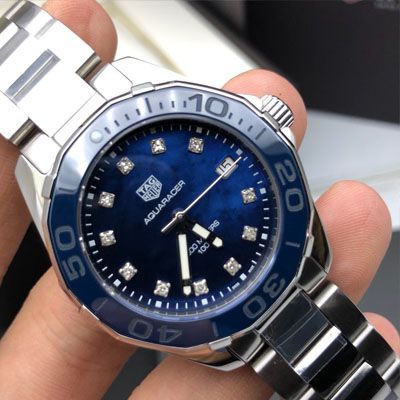 配包装新品首发~angelababy同款女装,泰格豪雅TAG Heuer竞潜系列,蓝面珍珠贝母表盘镶嵌11颗1.6大钻石,腕表搭载ETA955.412豪雅原版金面机芯(石英),表头直径35毫米,单向旋转表圈,抛光精钢搭配陶瓷表圈,原厂配件搭载原装机芯整一个完美体现,专柜售价1.5万+,全套包装出货……
