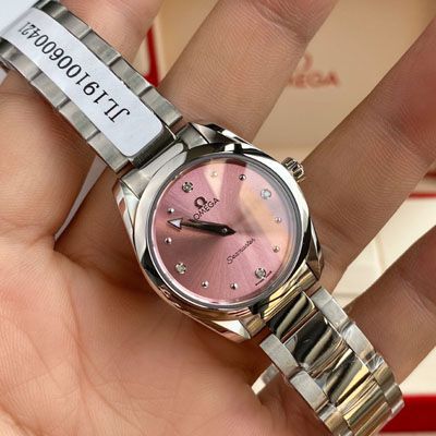 专柜爆款,独家首发!欧米茄海马系列Aqua Terra女士腕表环镶璀璨美钻,诠释精致迷人风范。这款精钢腕表采用对称设计28毫米表径,非常秀气、精美绝伦!配备闪烁微光的白面表盘,8枚圆点镀铑小时刻度和4枚钻石小时刻度贴镶于镀铑托槽之上。指针亦经过镀铑处理,表背于波纹背景之上浮雕欧米茄海马徽章图案。腕表搭配精钢表链,内部搭载欧米茄4061机芯。配全套包装,带GTC证书出货!