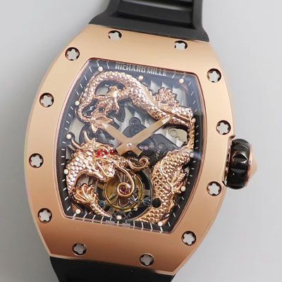 TW工厂 RICHARD MILLE理查德米勒:RM057 成龙盘龙陀飞轮腕表!大胆运用全新性能的材质,延续奢华精致的时间艺术,将先进科技与精湛手工工艺完美融合,耗费无数个小时手工雕刻身披彩鳞的金龙,五趾龙爪紧握着陀飞轮夹板,气势磅礴,底板边缘刻有圆形的