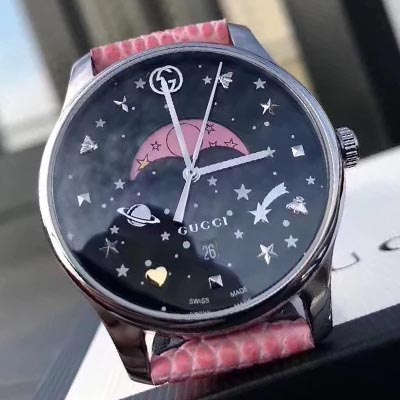 独家一手渠道货!Gucci专柜最新月相石英女表,36毫米抛光不锈钢薄表壳,搭配interlocking G表冠,黑面涂漆效果的表盘,配以银面星星和星球图案,Gucci刻度:interlocking G、蜜蜂、星星、铆钉和玫瑰金面心形,以及粉面、彩面月相盘,搭配金黄面彗星图案,按扣底盖,配以蜜蜂雕花,蜥蜴皮表带配以不锈钢针式带扣,原装瑞士朗达石英月相机芯,蓝宝石面水晶,配以防反光涂层,防水级别达到5 ATM(160英尺/50米)2年质保,配原盒,厉害了这个货,要的快了