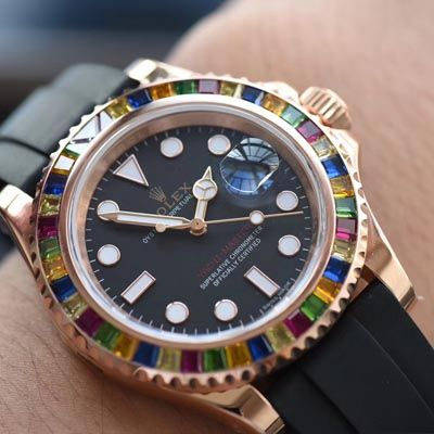 N厂欧洲订制版 2836机芯2017年瑞士巴塞尔钟表展新款“糖豆”圈劳力士游艇,116695SATS,史上最精湛的彩钻潜水腕表,和正品一致的定制级Tutti Frutti风格五面彩钻,纯手工独立镶嵌,三角钻石采用明亮式切割最接近正品的切割方式,附赠胶带一副和欧版劳力士定制原厂黑面绒布袋一个,N厂史上第一款欧洲的高端彩钻圈产品。