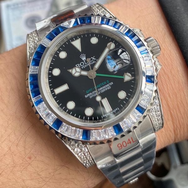 劳力士T钻奢华版格林尼治GMT 表圈,表耳均手工镶嵌 直径40mm 采用克隆3186机芯 绿针在时分针中间同步正品 时针单独调 可顺调逆调日历 十分漂亮