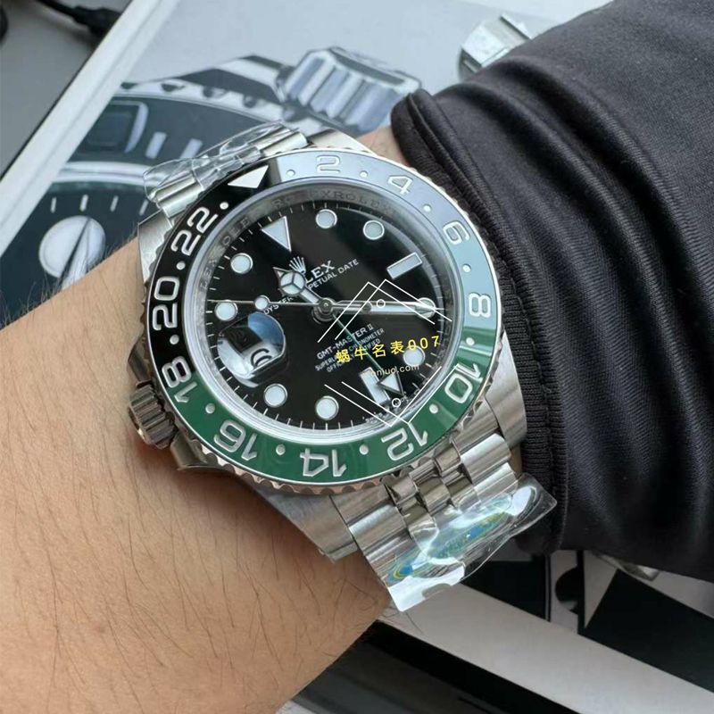 c厂gmt雪碧126720对比 雪碧圈即126720左撇子版本的gmt毋庸置疑是劳力士,它的前身可以追溯到劳力士1950年中期6542左撇子版本,以及1675也有左撇子版本,但是数量非常稀少。但是和新款雪碧圈不同的是,只有雪碧圈,日历窗和把头都变成了9点位置,其他的老款日历依旧再正常的3点位,只是变换了把头位置,至于美丑,各花入各眼吧。 本次采用的依旧是丹东3285机芯,稳定性 动力存储自然不用过多赘述。 图片山不难看出,雪碧圈的难点在于陶瓷圈上的黑面与绿面的拼接过渡效果,以及绿面部分的面差问题,因为clean有了最早开发绿水鬼圈口的经验,所以再这次的雪碧圈中,自然也是信手拈来,绿面部分几乎无面差,黑绿衔接部分,也有了真品一般沁面的效果。 表壳表带以及表盘可以通过图片看到做工也是非常的好。Clean对于这些细节上有这非常严格的把控。 重点!!!Clean在2022年末升级了所有款式的的表扣上的小皇冠,皇冠底部为抛光,并且皇冠的表面依旧保持平整,这个在整个行业都属于先驱之举,制作工艺也是相当复杂,后面会放上对比图。这种细枝末节的部分。Clean一直都是极致的追求。