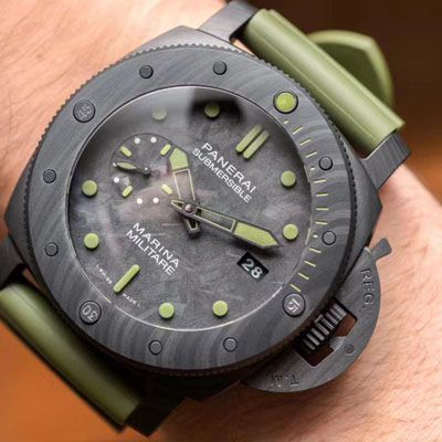 47MM聚合碳纤维Carbotech材质枕形表壳,轻于钛,硬于钢。大理石花纹黑面碳纤⾯盘,深橄榄绿夜光時標、指針,天然橡胶表带。最鲜实拍图,这一定能掀起不少人心中的一股军绿英雄情结!腕表,是男人魅力加分的武器!潜行系列最受注目的一款腕表PAM961 ,直面极限,突破自我!尽显硬朗帅气的军人风范。