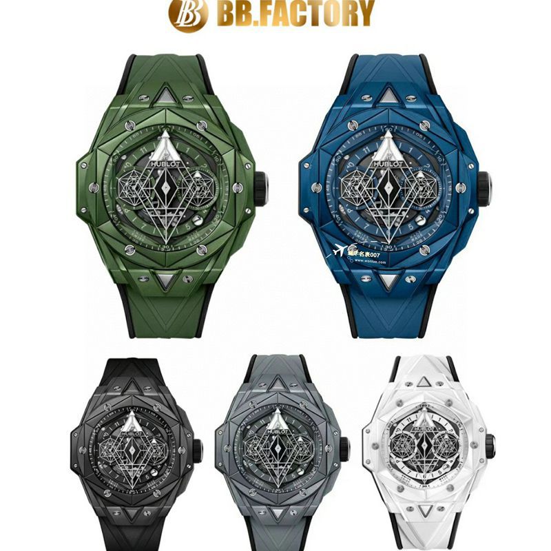 BBF极限复刻 HUBLOT宇舶表全新 Sang Bleu II刺青二代腕表 恒宝最热门款 市面唯一标配全部钛金属,经过抛光、缎面、切片、雕刻、倒角以及刻面处理,呈现出交替叠加的六边形、菱形以及三角形,营造出和谐迷人的视觉效果 定制恒宝专属UNICO HUB 1240自动飞返计时机芯,业内唯一对版4.5字位镂空日历环与窗口,3字盘60分钟计时(注:市面7750机芯均只能计时30分钟)8字位水平离合, 9字位小秒轮。同步原装半牙型表冠刺青标志永远向上。 批边蓝宝石水晶表镜,拉砂工艺七彩纹指针质感无可挑剔 尺寸45mm 厚度16.6mm 重量153克,相似度达95%以上 全部功能完美实现 天花板级别 欢迎玩家品鉴 (BBF出品 必属精品)