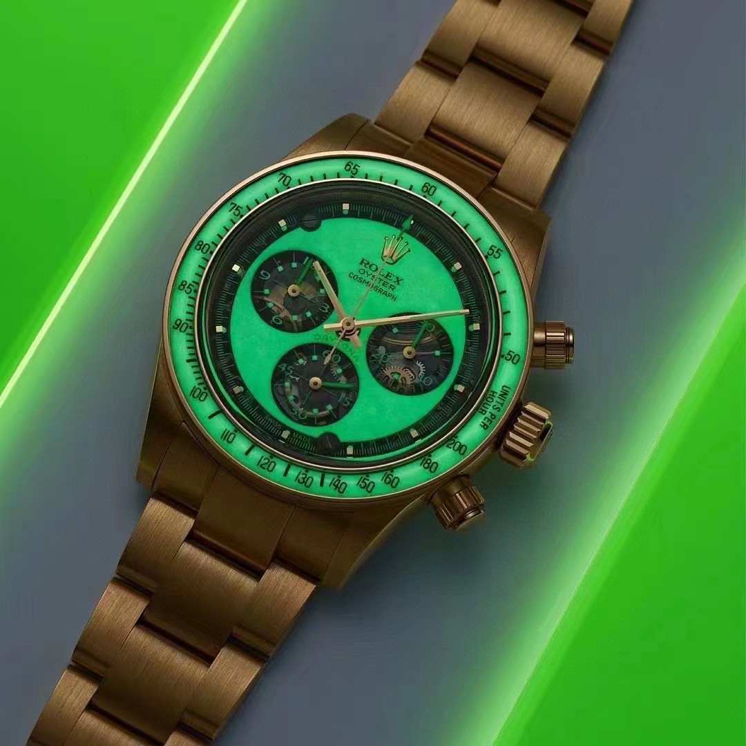 2、夜光材料凸显了每一个细节——表圈生动、独特的面调与光滑表面的魅力相映成趣。Super-Luminova 指针在表盘上带有 12 个霓虹灯参考点,营造出迷人的视觉张力。表圈采用孤形蓝宝石,辅以新开发的霓虹绿发光嵌件,唤起了过去时代的魅力。