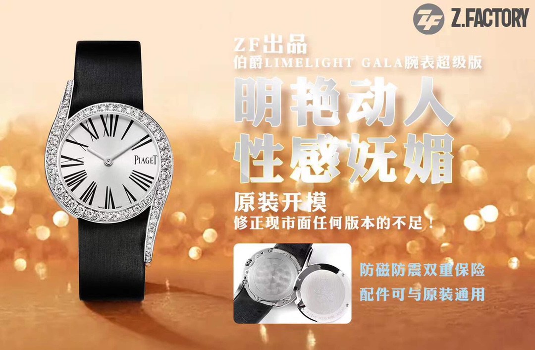 ZF出品伯爵Limelight Gala腕表超级版,原装开模,修正现市面任何版本的不足!【精彩细节】腕表尺寸26mmX7mm1.ZF运用一流的壳套打磨工艺,诠释伯爵优雅气质。2.底盖的贵金属钢印清晰明朗,苍劲有力。3.底盖结构同步正品,采用双层防磁防震设计。4.采用定制版瑞士石英机芯,续航给力,走时稳健,零返修。5.镶饰60颗明亮式切割施华洛世奇美钻(约0.92克拉)。表扣镶饰单颗明亮式切割施华洛世奇美钻(约0.01克拉)动人线条衬托优雅气质 ZF出品 必属精品!
