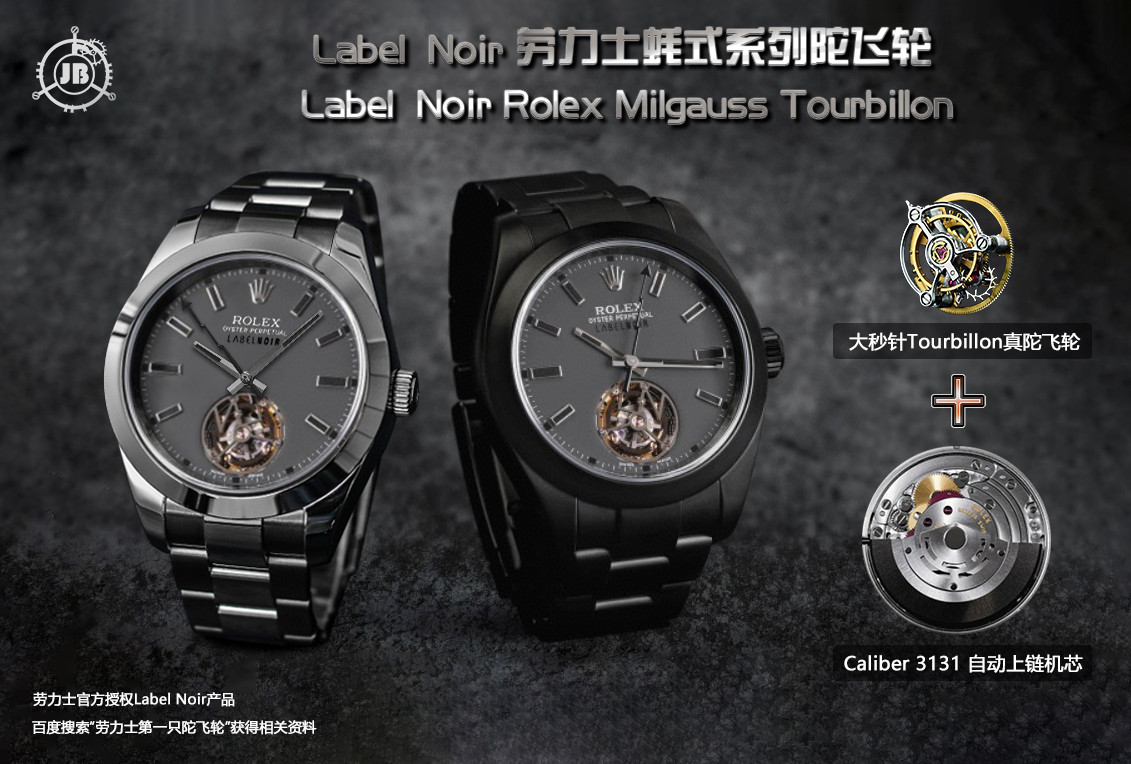 JB劳力士Label Noir蚝式陀飞轮,第一枚外媒认可的带陀飞轮的劳力士腕表,JB工厂和Label Noir官方一样基于Milgauss蚝式116400闪电针的数据进行开发,制表师在3131自动机械机芯的基础上进行了深度开发,拆除了51个组件,然后增加了94个新组件,并对2枚组件进行了改装,搭载第一枚大秒海鸥陀飞轮机芯,也是COPY界又一次技术突破。最终的结果是拥有了世界上第一只劳力士真陀飞轮腕表暨第一只带大秒针陀飞轮。精钢表壳进行了黑面PVD,表盘被改为哑光灰面,指针和时标同样为黑面,和劳力士蚝式一样的折叠表扣——总而言之,蚝式鲜亮的字面被替换为低调高档的深面,让你的注意力集中在6点的陀飞轮上。12点的「Milgauss」铭文被修改为「Label Noir」。劳粉可以百度搜索“世界上第一枚带陀飞轮的劳力士”获得相关资料。官方源视频https://v.qq.com/txp/iframe/player.html?vid=j13483ka3me,这样呕心沥血打造的一款极品劳力士,不但佩戴起来帅气有逼格,而且可玩度非常高,值得收入囊中。JB FACTORY在罗杰杜比RD双陀飞轮和理查德米勒RM陀飞轮后又一神作,JB工厂-专为顶级陀飞轮而生。